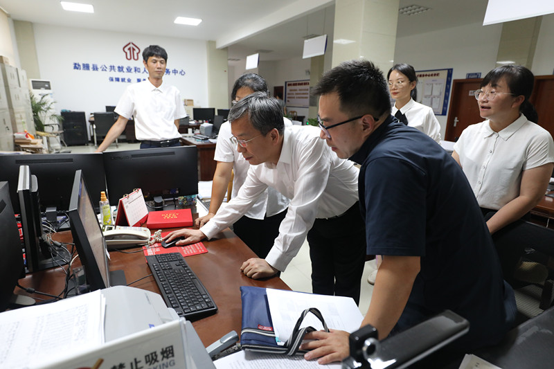 在勐腊县人社局调研时,刘立志到人社服务大厅,实地查看群众在综合受理窗口办理人社业务的情况,亲自操作了全省公共就业服务信息系统。随后,刘立志与县人社局干部职工代表进行座谈交流,听取大家对做好人社工作的意见建议,对提升境外人员入境务工、建设好全省公共就业服务信息化平台等方面工作征求了意见建议。