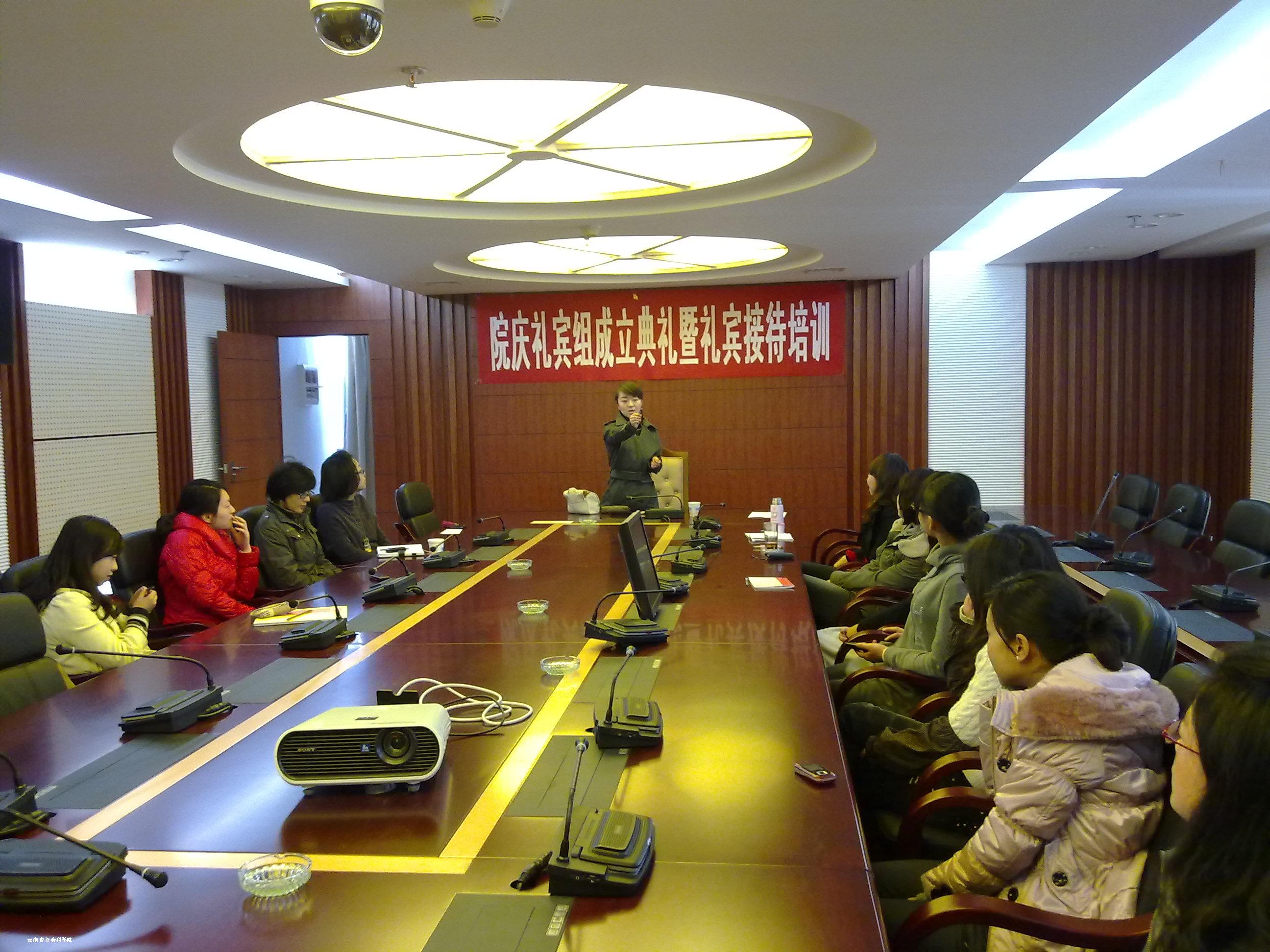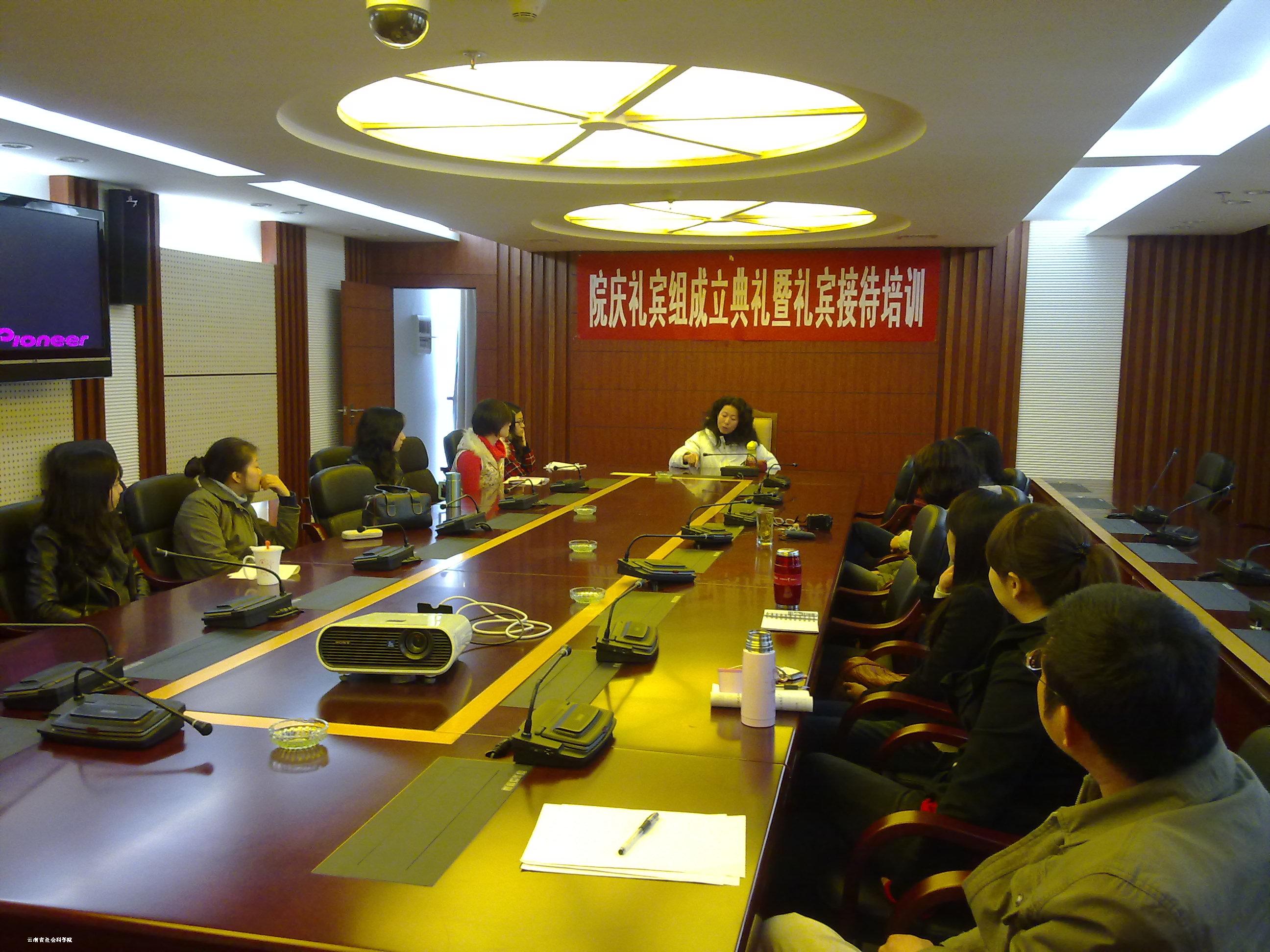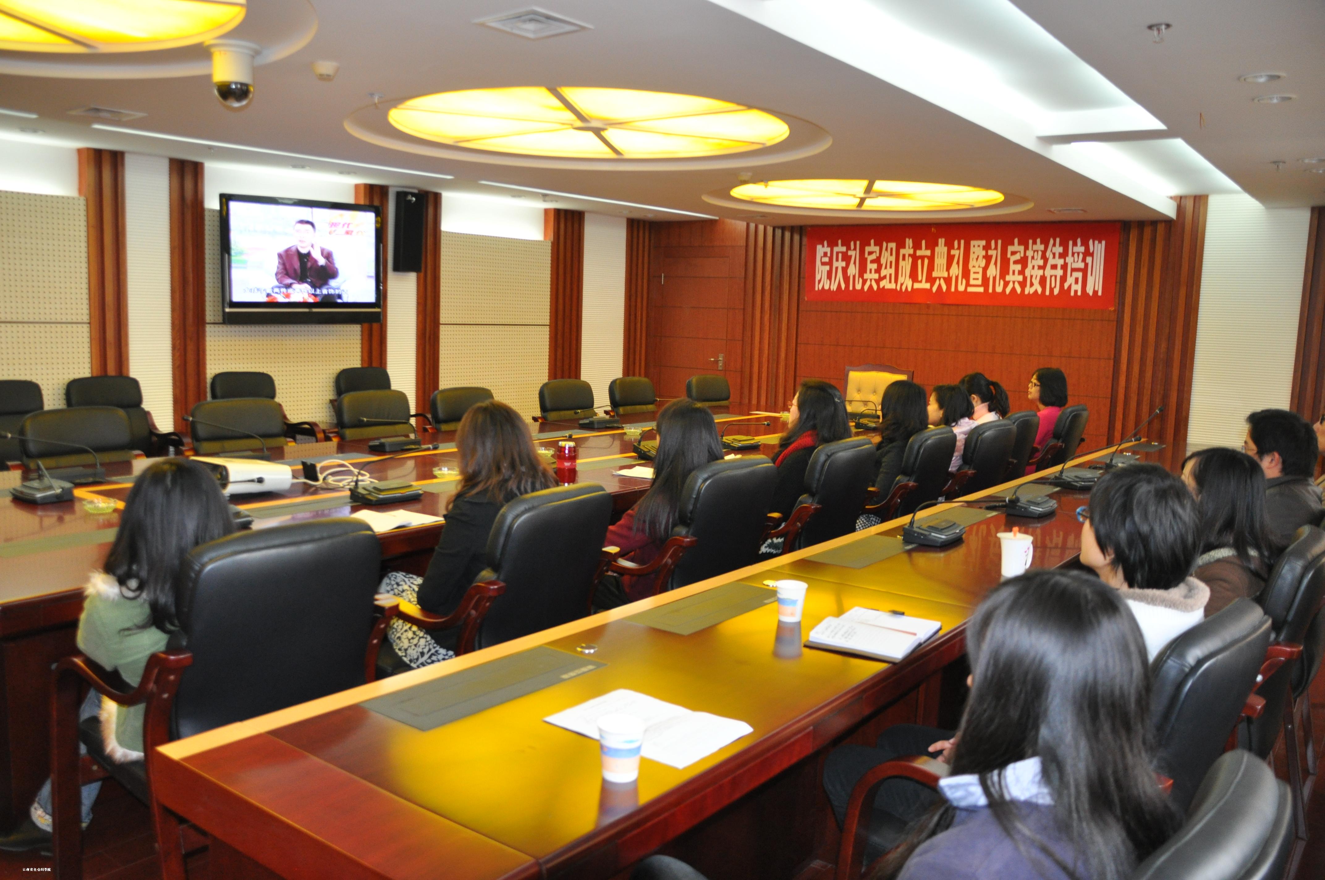 成立仪式结束后,全体礼宾人员、外宾接待组以及院内外对礼仪感兴趣的人士参加了接待培训。培训内容主要涉及接待、仪表和外事。礼宾人员在观看了由金正昆教授主讲的《政务礼仪•接待》、《服务礼仪•仪表》、《国际礼仪•外事》DVD后,刘婷、攸扬、陈亚辉分别就礼仪接待细节、化妆技巧、外事会议接待礼仪对礼宾人员作了实例讲解,并就院庆接待时涉及的重要内容作了强调。礼宾人员也就培训内容踊跃发言,营造了活跃的交流气氛,使培训超出了预期效果。