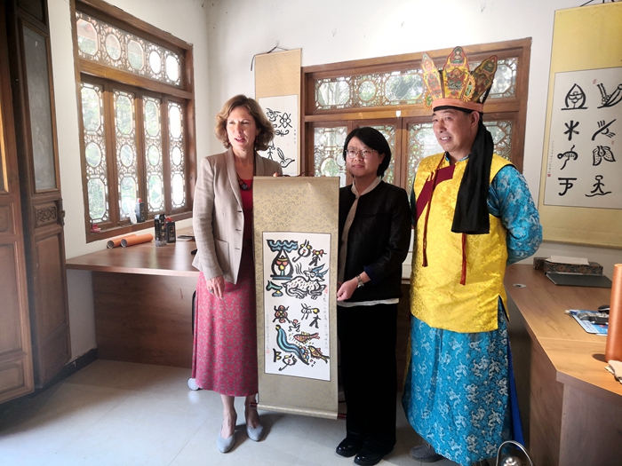 吴若兰大使进入文献馆后现场观摩了东巴文书法艺术,现场书写的东巴文书法让吴若兰大使回忆起30年前在丽江获赠的东巴文谚语作品,和正文东巴再次将这份珍藏在大使记忆中充满哲理的文字用东巴文书写下来赠予大使。
