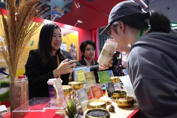 11月9日,上海,泰国以主宾国身份参与第八届进博会,精心打造640平方米泰国农食产品企业馆。图为泰国参展商推介泰国香米。中国已成为泰国最大的农产品出口市场。视觉中国供图
