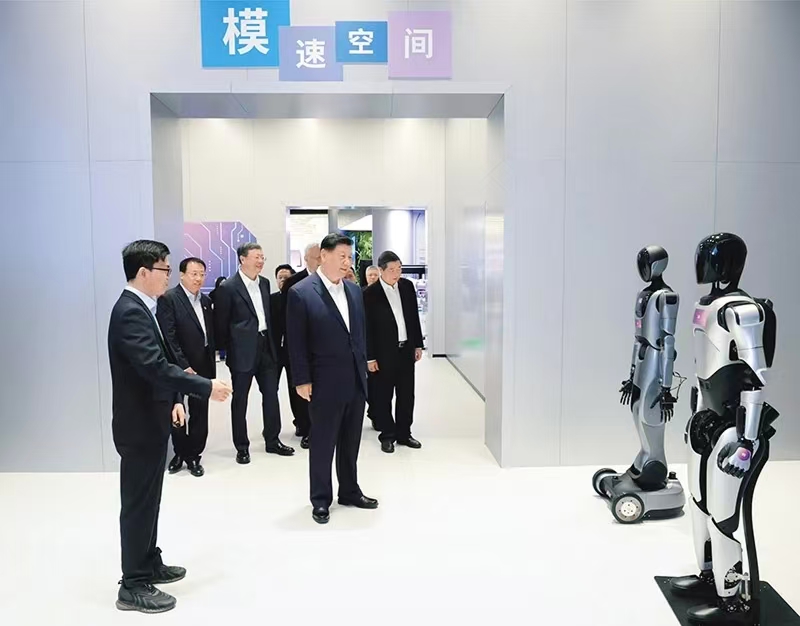 2025年4月29日,中共中央总书记、国家主席、中央军委主席习近平在上海考察。这是习近平在位于徐汇区的上海“模速空间”大模型创新生态社区,听取相关技术研发和企业生产经营介绍。 新华社记者 王晔/摄