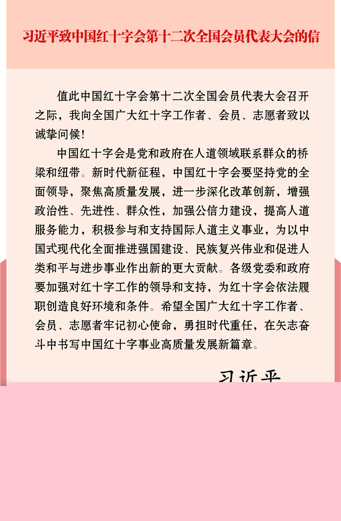 习近平致信中国红十字会第十二次全国会员代表大会强调 聚焦高质量发展提高人道服务能力 为强国建设民族复兴和人类和平与进步事业作出新的更大贡献 韩正出席开幕式并会见全体代表 新华社北京10月9日电 在中国红十字会第十二次全国会员代表大会召开之际,中共中央总书记、国家主席、中央军委主席习近平致信大会,向全国广大红十字工作者、会员、志愿者致以诚挚问候,并对做好红十字工作提出希望。 习近平在信中指出,中国红十字会是党和政府在人道领域联系群众的桥梁和纽带。新时代新征程,中国红十字会要坚持党的全面领导,聚焦高质量发展,进一步深化改革创新,增强政治性、先进性、群众性,加强公信力建设,提高人道服务能力,积极参与和支持国际人道主义事业,为以中国式现代化全面推进强国建设、民族复兴伟业和促进人类和平与进步事业作出新的更大贡献。 习近平强调,各级党委和政府要加强对红十字工作的领导和支持,为红十字会依法履职创造良好环境和条件。希望全国广大红十字工作者、会员、志愿者牢记初心使命,勇担时代重任,在矢志奋斗中书写中国红十字事业高质量发展新篇章。 中国红十字会第十二次全国会员代表大会9日在京开幕,会上传达习近平致信。国家副主席韩正出席开幕式并会见全体代表。 10月9日,中国红十字会第十二次全国会员代表大会在北京开幕,会上传达中共中央总书记、国家主席、中央军委主席习近平致信。国家副主席韩正出席开幕式并会见全体代表。新华社记者 王晔 摄 10月9日,中国红十字会第十二次全国会员代表大会在北京开幕,会上传达中共中央总书记、国家主席、中央军委主席习近平致信。国家副主席韩正出席开幕式并会见全体代表。新华社记者 高洁 摄 中共中央政治局委员、国务院副总理刘国中在开幕式上代表党中央、国务院致辞并参加会见。他说,中国红十字会第十一次全国会员代表大会以来,在以习近平同志为核心的党中央坚强领导下,红十字事业取得显著成绩。新时代新征程,中国红十字会要深入贯彻习近平新时代中国特色社会主义思想,加强党的全面领导,确保正确政治方向。强化“三救三献”本职工作,持续提升业务能力,协助党和政府织密织牢民生兜底保障网。深入推进红十字会改革,增强服务意识,锤炼过硬作风,深化国际交流合作,为推动红十字事业高质量发展作出新贡献。 全国人大常委会副委员长何维出席上述活动。 大会开幕式由中国红十字会会长陈竺主持。红十字国际委员会代表、红十字会与红新月会国际联合会代表分别致辞。中华全国总工会书记处第一书记徐留平代表群众团体致辞。会议表彰了32个全国红十字会系统先进集体和10名先进工作者。 10月9日,中国红十字会第十二次全国会员代表大会在北京开幕,会上传达中共中央总书记、国家主席、中央军委主席习近平致信。国家副主席韩正出席开幕式并会见全体代表。这是大会会场。新华社记者 高洁 摄