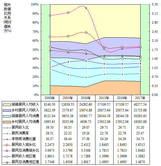 图注:据《中国统计年鉴》历年卷发布的基础数据演算。贯彻“以人民为中心”的发展思想,应以人民生活检验发展成效,特选择最具代表性的民生数据。左轴面积(元转换%):城镇、乡村居民收入、总消费人均值,城乡间收入、消费数值呈直观比例关系;左轴曲线(%):居民收入比(与国民总收入极度近似值产值比)、消费率(与产值比)、非物质生活消费(占总消费)比重;右轴曲线:居民收入、总消费人均值城乡比(倍差指数,乡村=1)、地区差(偏差指数,无差距=1)。特别请注意各项比值、城乡比和地区差历年变化动态,其中潜藏均衡增长高质量发展深刻涵义。