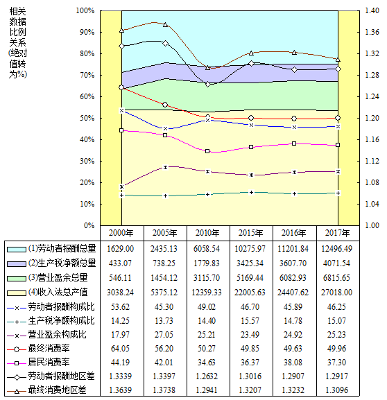 图注:据《中国统计年鉴》历年卷发布的基础数据演算。经济发展应以人民为中心、以劳动者为中心,特选择收入法、支出法产值结构体系及其民生相关数据。左轴面积(亿元转换%):(1)“居民部门”劳动者报酬、(2)“政府部门”生产税净额、(3)“企业部门”营业盈余、(4)收入法产值总量,其间呈直观比例关系,(4)-(1)-(2)-(3)=固定资产折旧(图中省略);左轴曲线(%):收入法产值中报酬、净税、盈余构成比,支出法产值中最终消费率,初次分配收支中居民消费率;右轴曲线(偏差指数,无差距=1):劳动者报酬、最终消费人均值地区差。特别请注意各项比值、地区差历年变化动态,其中潜藏结构优化高质量发展深刻涵义。