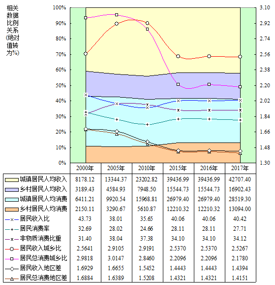 图注:据《中国统计年鉴》历年卷发布的基础数据演算。贯彻“以人民为中心”的发展思想,应以人民生活检验发展成效,特选择最具代表性的民生数据。左轴面积(元转换%):城镇、乡村居民收入、总消费人均值,城乡间收入、消费数值呈直观比例关系;左轴曲线(%):居民收入比(与国民总收入极度近似值产值比)、消费率(与产值比)、非物质生活消费(占总消费)比重;右轴曲线:居民收入、总消费人均值城乡比(倍差指数,乡村=1)、地区差(偏差指数,无差距=1)。特别请注意各项比值、城乡比和地区差历年变化动态,其中潜藏均衡增长高质量发展深刻涵义。