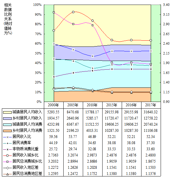 图注:据《中国统计年鉴》历年卷发布的基础数据演算。贯彻“以人民为中心”的发展思想,应以人民生活检验发展成效,特选择最具代表性的民生数据。左轴面积(元转换%):城镇、乡村居民收入、总消费人均值,城乡间收入、消费数值呈直观比例关系;左轴曲线(%):居民收入比(与国民总收入极度近似值产值比)、消费率(与产值比)、非物质生活消费(占总消费)比重;右轴曲线:居民收入、总消费人均值城乡比(倍差指数,乡村=1)、地区差(偏差指数,无差距=1)。特别请注意各项比值、城乡比和地区差历年变化动态,其中潜藏均衡增长高质量发展深刻涵义。