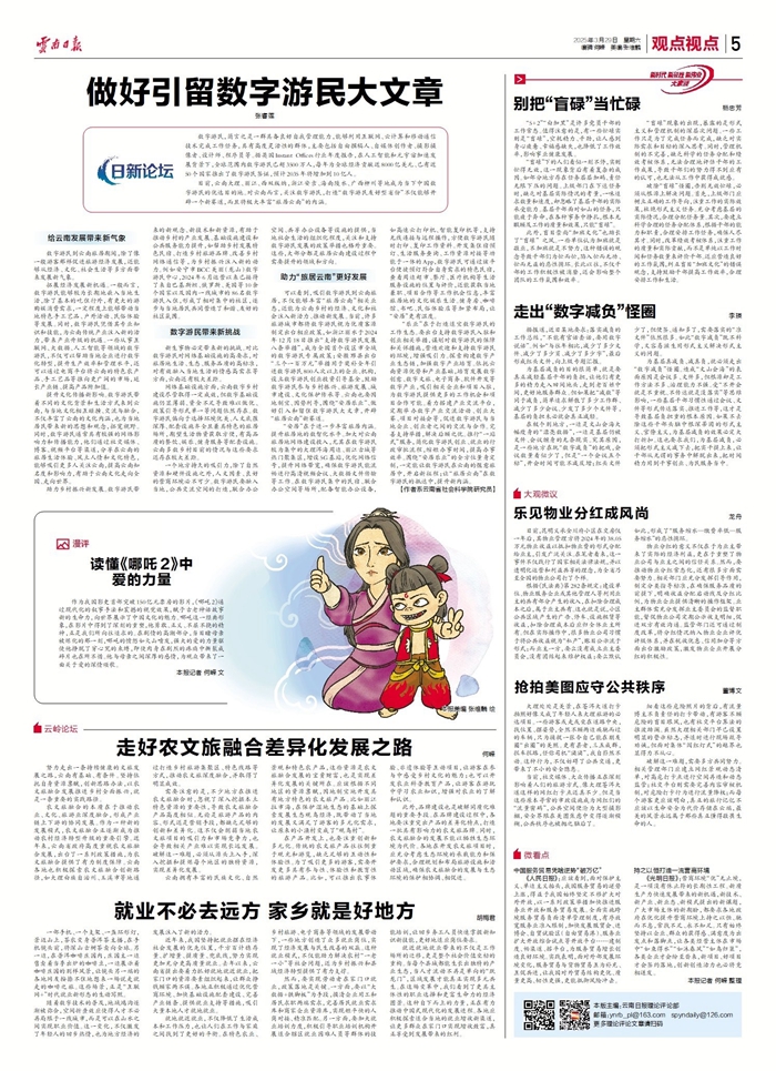 “乐业”在于打造适宜数字游民的工作生态。要出台支持数字游民入驻和创业相关举措,谋划对数字游民的保障和关怀措施,营造欢迎和支持数字游民的环境,增强吸引力。探索构建数字产业生态链,加强数字产业培育。依托云南资源优势和产业基础,培育发展数字创意、数字文旅、电子商务、软件开发等数字产业,吸引相关企业和项目入驻,为数字游民提供更多的工作机会和项目合作可能。着力搭建产业交流平台,定期举办数字产业交流活动、创业大赛、项目对接会等,促进数字游民与当地企业、创业者之间的交流与合作。完善支持举措,解决后顾之忧。推行“一站式”服务,简化数字游民创业、就业的行政审批流程,缩短办事时间,提高办事效率。围绕“安居乐业”的全方位量身定制,一定能让数字游民在云南的惬意旅居中,开启新征程;让“旅居云南”在数字游民的抵达中,提升新内涵。