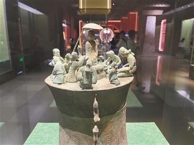 出土于江川李家山墓地的展品纺织场面铜贮贝器,则反映了滇人生活的另一面。器盖上立雕10人,皆为女性:中央鼓上跪坐一个贵妇,通体鎏金,贵妇身边放有壶、豆、盘等器皿;旁有3个侍女,分别捧送食盒、执伞,跪坐听候差遣;周围有两人一坐一立,面面相对作理线状;另有四人面向中央席地而坐,用“腰机”织布。该贮贝器器盖上的人物形态栩栩如生,主题突出,表现的是古滇国贵妇主持纺织活动的场面。贮贝器本为存放贝币的器物,不过,它的工艺价值远超其实用功能,为研究滇国时期的纺织、发饰、服装等提供了重要的实物资料。