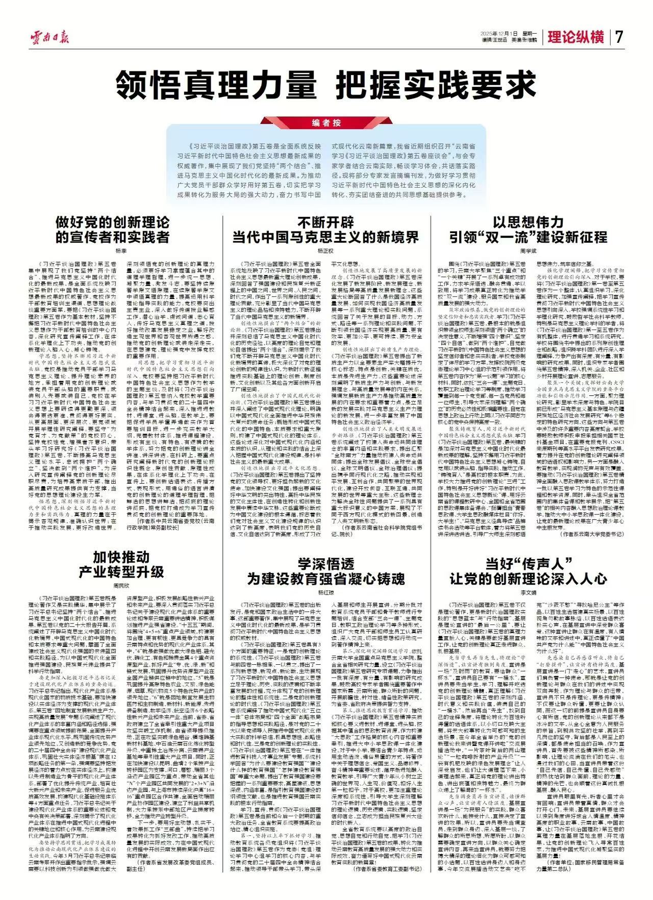创造性地提出了“两个结合”的新论断。《习近平谈治国理政》第五卷提出并深刻总结了马克思主义中国化时代化的历史经验,以高度的理论自觉和理论自信提出“两个结合”,深刻揭示了我们党不断开辟马克思主义中国化时代化新境界的真谛,极大深化了对党的理论创新的规律性认识,为新时代新征程推进实践基础上的理论创新、制度创新、文化创新以及其他各方面创新开启了广阔空间。