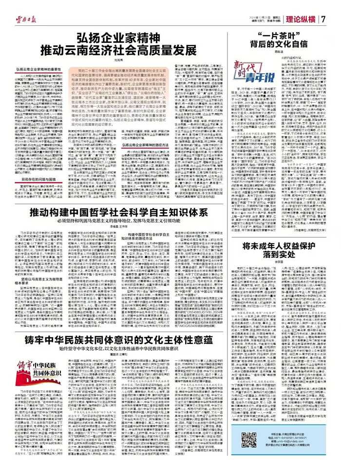 党的二十届三中全会指出高质量发展是全面建设社会主义现代化国家的首要任务,强调要健全推动经济高质量发展体制机制,构建支持全面创新体制机制。改革开放40多年来,企业家对中国经济的高速增长作出了重要贡献。新时代,企业家更是发展创新型经济、推动新质生产力的中坚力量。云南很早就涌现出“钱王”王炽、“实业巨子”“云南近代工业奠基人”缪云台、“云南白药创始人”曲焕章、“近代实业家”董澄农以及浦在廷、盛延龄、庾恩锡等一大批云南本土杰出企业家。改革开放以来,云南又涌现出杨宗祥、阮鸿献、柳万东等一大批全国知名企业家。他们奠定了云南企业家精神的底色,为高质量发展作出了重要贡献。新时代新征程,企业家精神不仅是世界经济复苏的重要推动力,更是经济高质量发展和中国式现代化的重要内驱力,弘扬云南企业家精神,是谱写中国式现代化云南篇章的迫切要求。