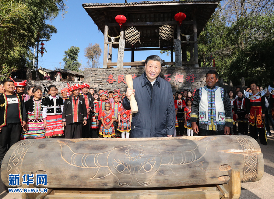 1月19日至21日,中共中央总书记、国家主席、中央军委主席习近平来到云南,看望慰问各族干部群众,向全国人民致以新春祝福。这是19日下午,习近平在腾冲市清水乡三家村中寨司莫拉佤族村广场上,敲响三声佤族木鼓,祝福来年风调雨顺、国泰民安。 新华社记者 鞠鹏 摄