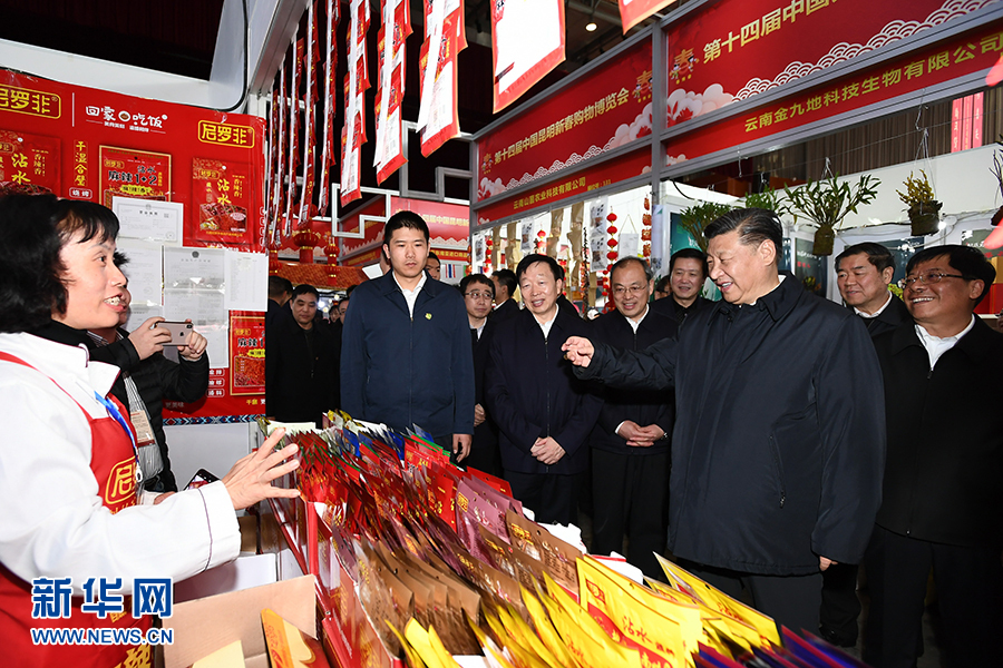 1月19日至21日,中共中央总书记、国家主席、中央军委主席习近平来到云南,看望慰问各族干部群众,向全国人民致以新春祝福。这是20日下午,习近平在昆明新春购物博览会年货街,了解春节前市场供应情况。 新华社记者 谢环驰 摄